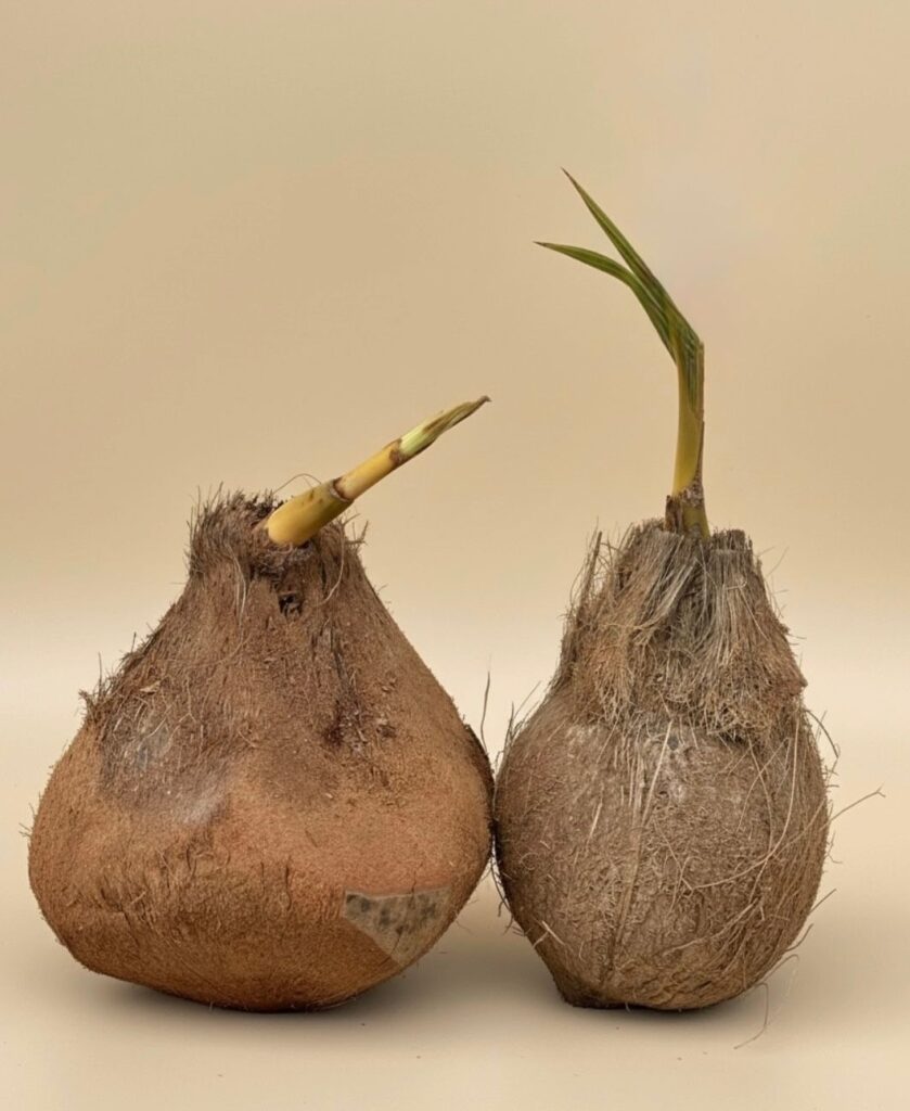Coco que ha iniciado la germinación (pulla). Contiene la codiciada Manzana de Coco, una pulpa esponjosa con un sabor dulce y único. Perfecto para degustar un manjar exótico o para siembra.